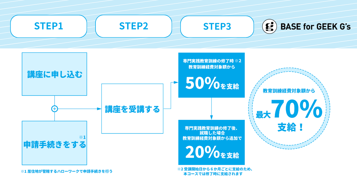 中長期的キャリア形成に役立つ教育訓練を対象としており、『第四次産業革命スキル習得講座』は、この対象の講座として認定されているため、支給要件を満たし申請を行えば、ハローワークから給付金が支給されます。