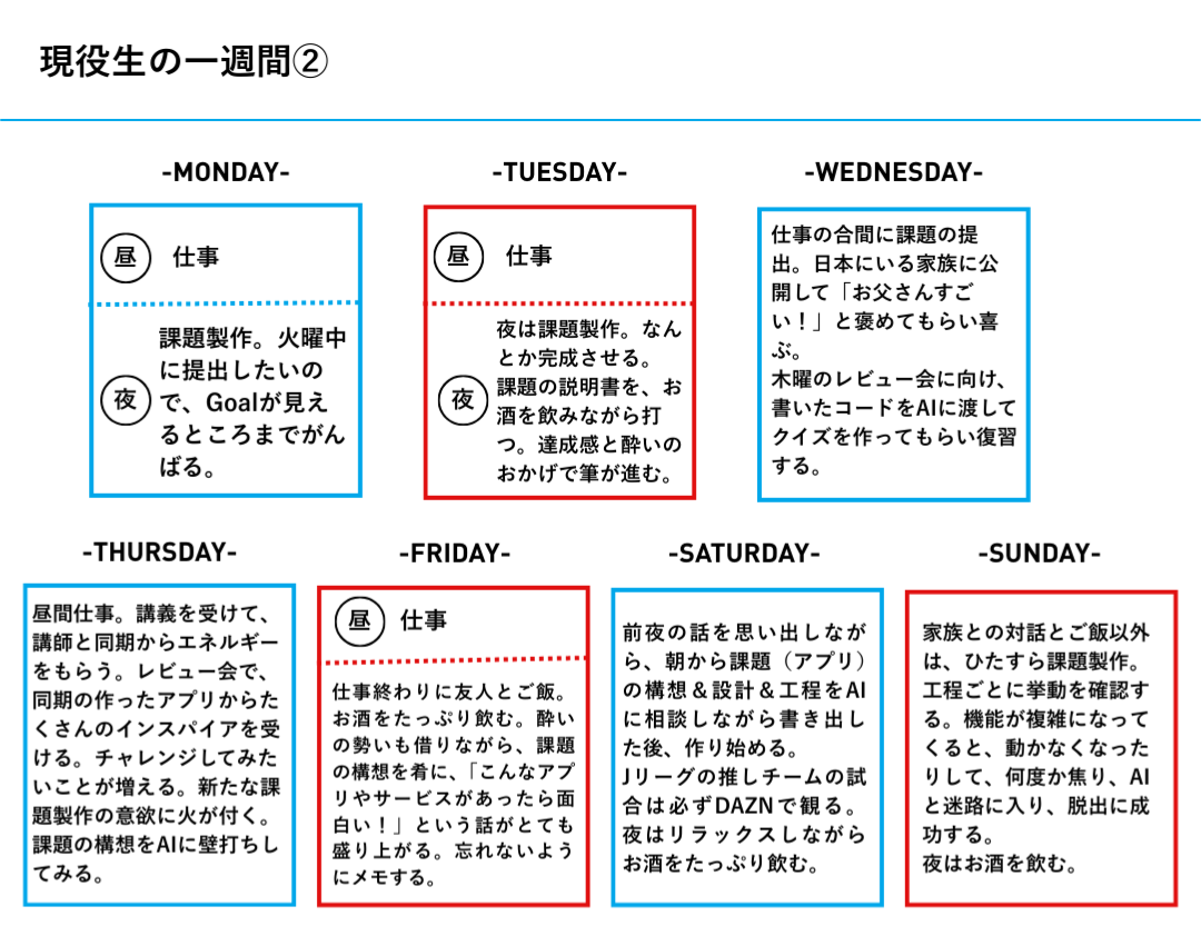 仕事や家事、育児といったマルチタスクをこなしながら、どのようにプログラミング学習の時間を捻出しているのか。密度濃い1週間のスケジュールをご覧ください。