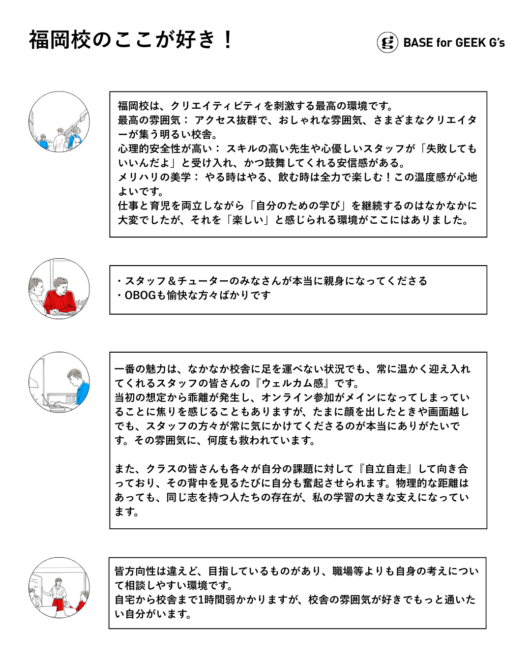 最後に、受講生たちが感じている福岡校というコミュニティの魅力についてご紹介します。