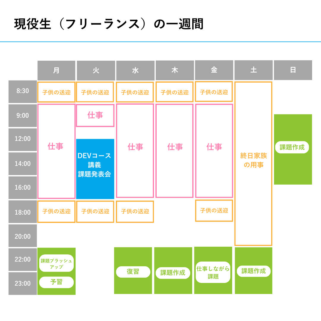 たとえば、上でご紹介したフリーランスの受講生は、朝夕の送迎や日中の業務をこなしながら、夜22時以降を「予習・ブラッシュアップ」の主戦場に設定しています。週末を家族との時間に充てつつ、平日の隙間時間を活用して課題を作りあげる。自律している大人だからこそできる、高密度な1週間の過ごし方が伺えます。