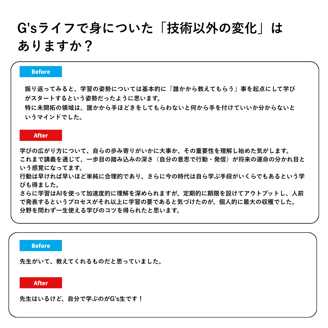 G’sでの生活を通じて得られる最大の収穫は、プログラミングスキル以上に「学び方そのものの変革」です。以前は「誰かに手ほどきをしてもらう」ことを起点にしていた姿勢から、今では「一歩目の踏み込みが運命を分ける」という確信への変化が伺えます。